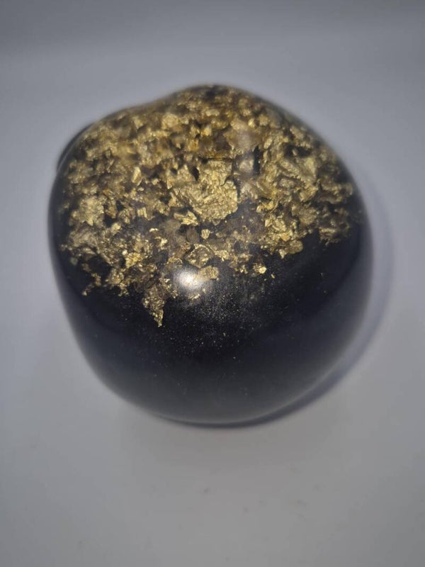 This skull is hand crafted from epoxy resin it is cast from black mica powder and gold flakes in the top, the eyes are painted silver with crome paint